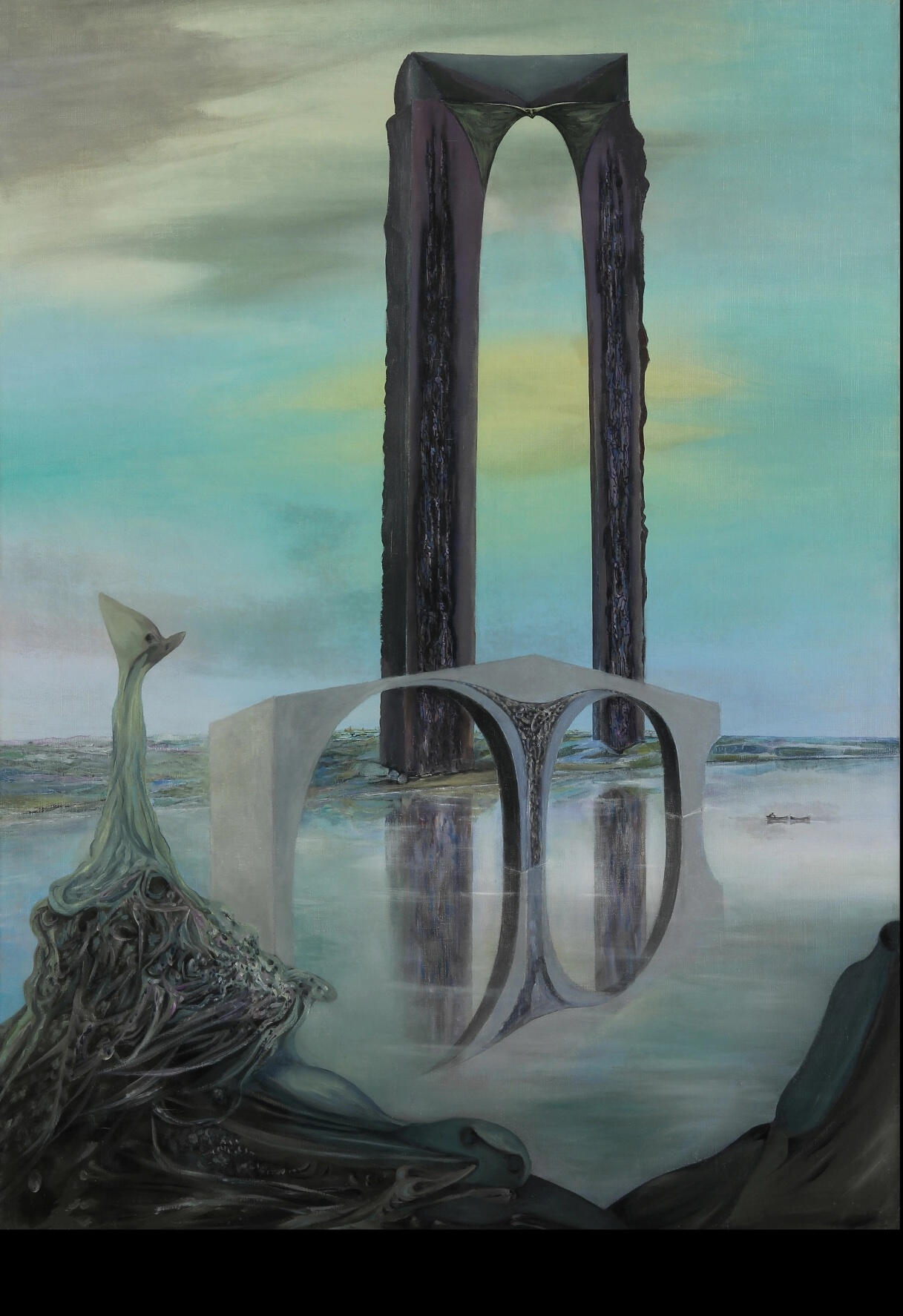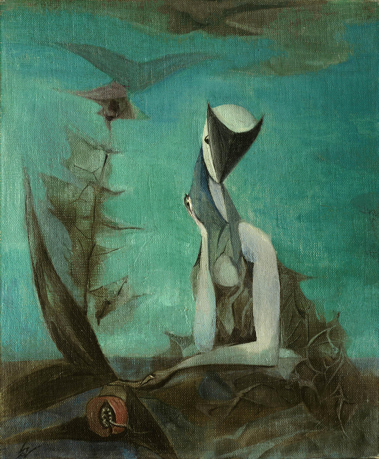 By the late 1930s, Paalen had become a respected voice within the Surrealist group in Paris, contributing not only as an artist but as a thinker. His interest in pre-Columbian art, anthropology, and non-Western cosmologies deepened after his relocation to Mexico in 1939, where he developed friendships with Frida Kahlo, Diego Rivera, and other members of the country’s vibrant cultural scene. This move marked a decisive turn in his artistic development: his canvases began to incorporate spatial structures inspired by indigenous architecture, natural rock formations, and cosmic landscapes.