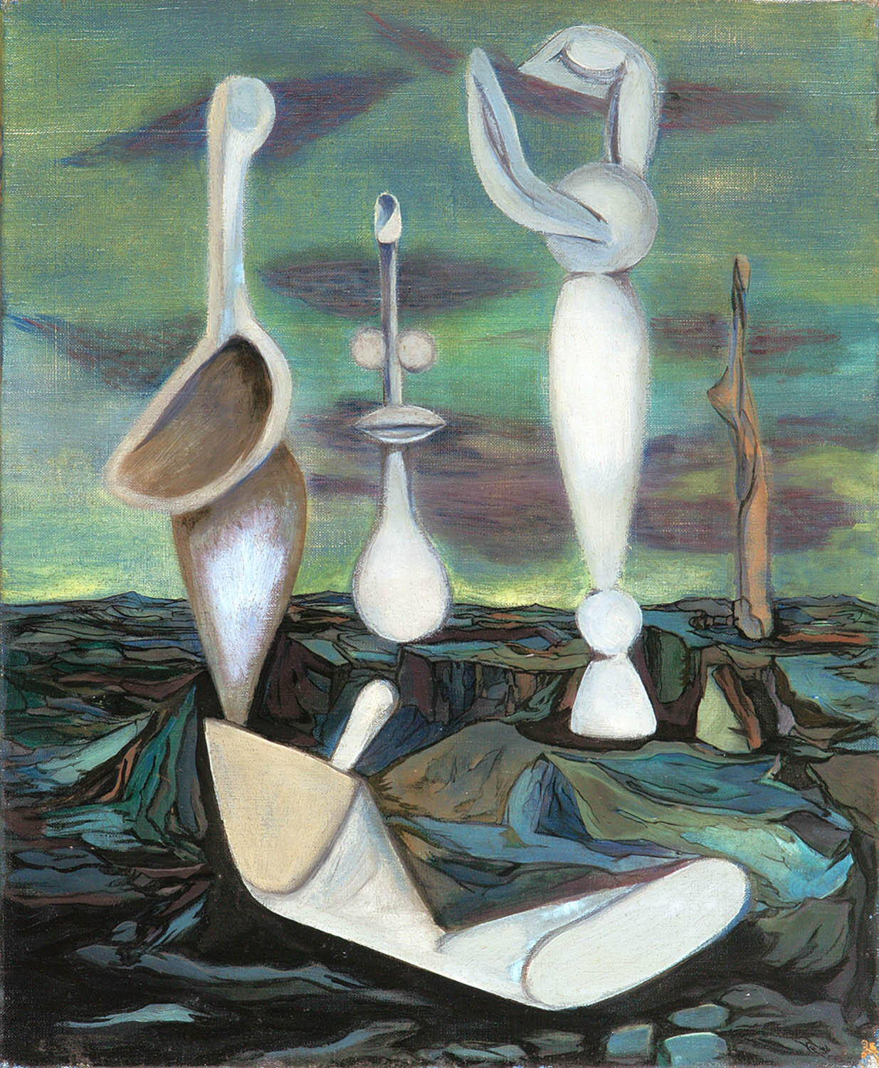 In his painting, Paalen sought to evoke mental states and cosmic forces rather than depict literal scenes. His palette often featured muted earth tones contrasted with bursts of luminous color, and his compositions suggested shifting perspectives, weightless forms, and atmospheric depth. Later works, such as his “space landscapes,” moved toward a lyrical abstraction, anticipating developments in mid-century American painting.